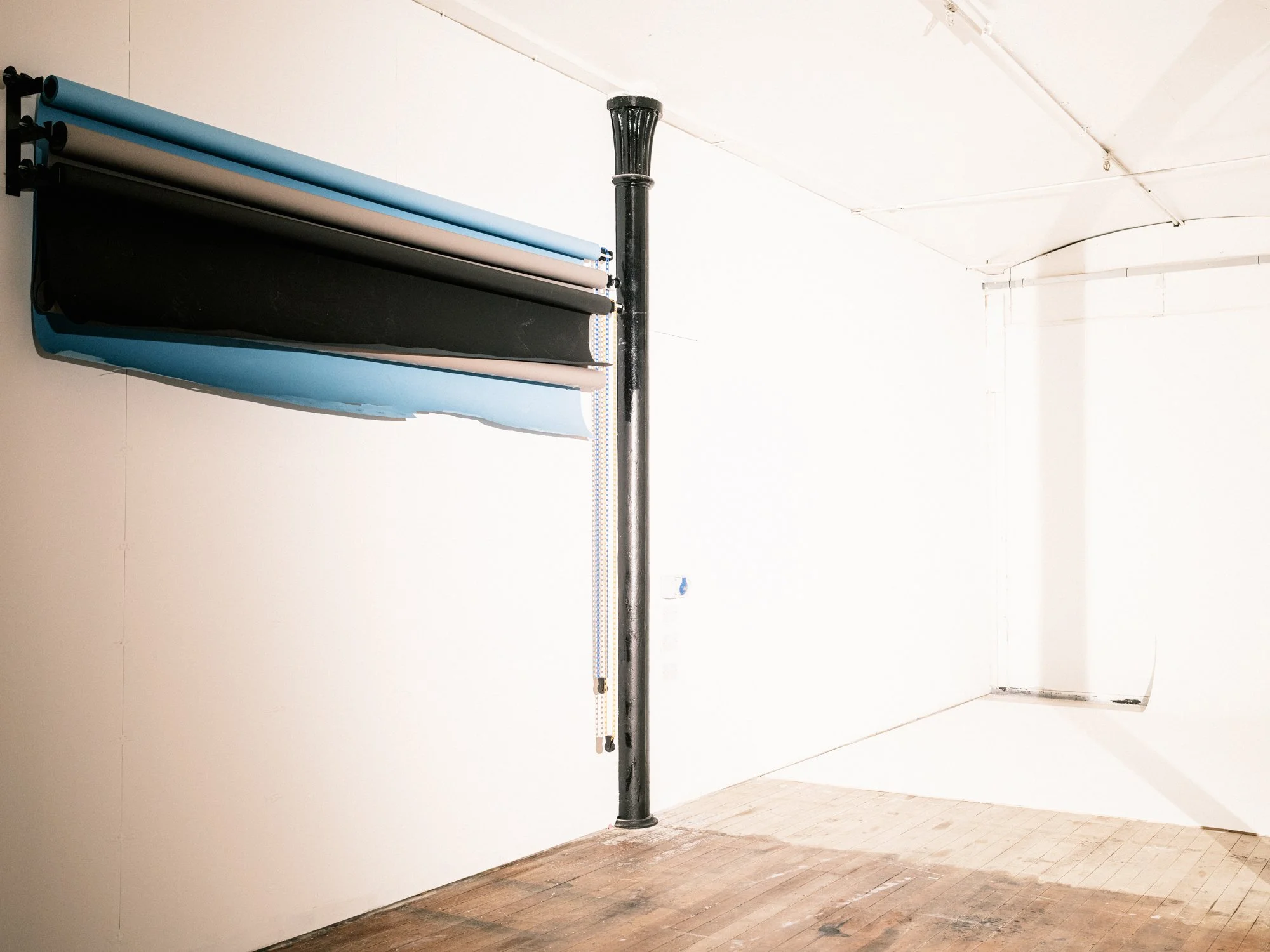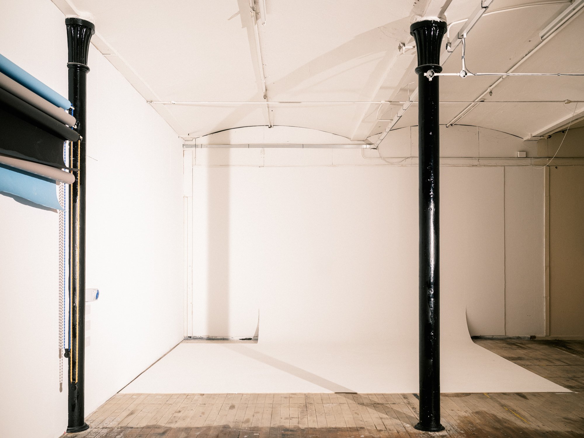 3m wide infinity cove, wall hung 2.72m triple colorama, stained glass windows and wooden floorboards, blackout possible.